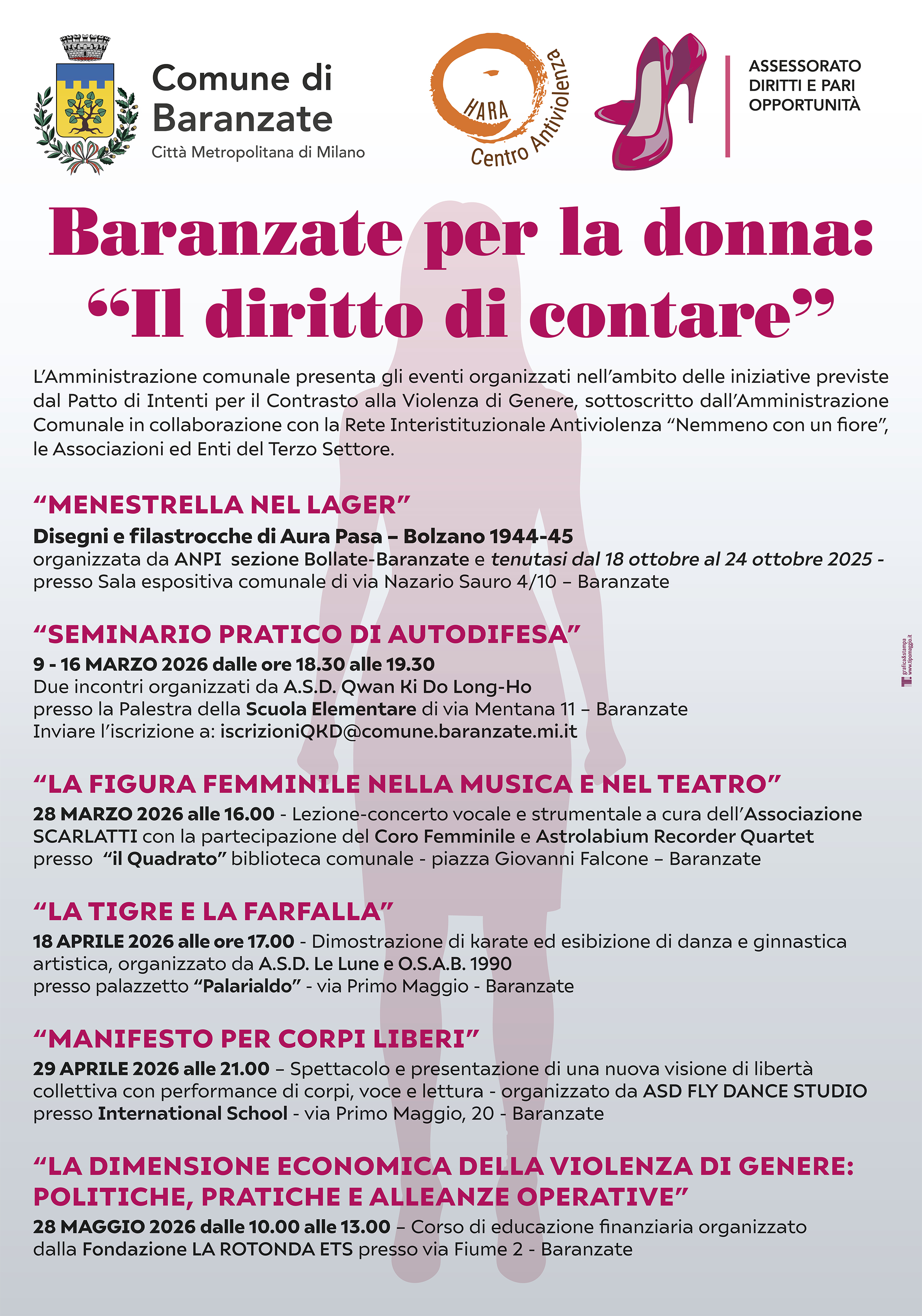 Nell'ambito delle iniziative previste dal Patto di Intenti per il Contrasto alla Violenza di Genere sottoscritto dall'Amministrazione Comunale in collaborazione con la Rete Interistituzionale Antiviolenza, l'Amministrazione Comunale presenta gli eventi dedicati al tema che si terranno sul nostro territorio tra marzo e maggio 2026.